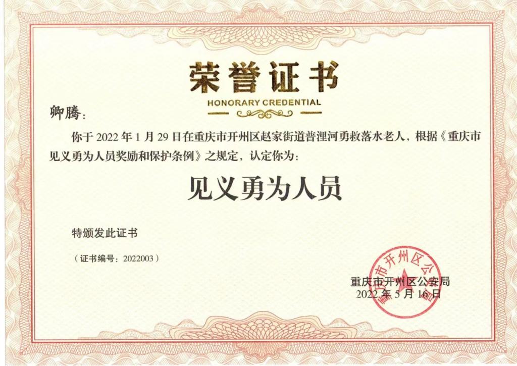 在今年寒冷的冬天,卿腾同学在老家重庆市冒着生命危险跳入水中勇救落水老人,成功挽救了79岁周某生命,其行为得到当地群众一致称赞,成为见义勇为模范榜样,今年5月,重庆市开州区给认定卿滕为“见义勇为人员”。卿滕今年23岁,家住重庆市开州区,西安交大成人漫画 热流科学与工程专业硕1044班学生,是一名入党积极分子。1月29日下午1点左右,卿腾接到来自他弟弟的电话,听闻码头处有个人漂在河面上后,他立...