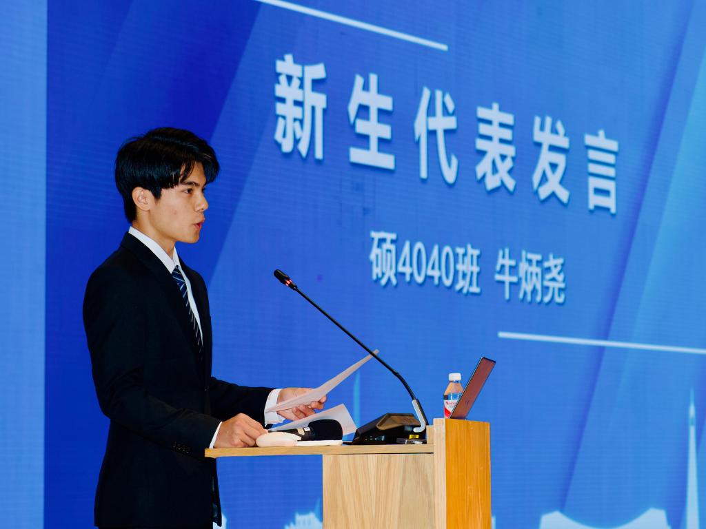 硕4040班牛炳尧作为新生代表进行发言。他表示,过去四年的交大生活塑造了自己坚毅的品格,站在新的起点上,要努力点亮信仰之光,做担当奉献的能动人,追寻科研之光,为国家科技自立自强贡献力量。未来将在交大的沃土上不断突破自我,迎接新高峰,与同学们共同开启人生新篇章。