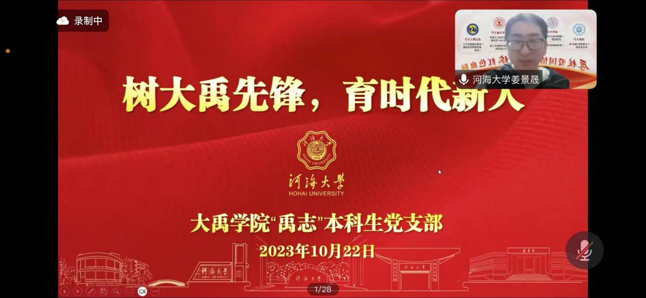 第一个发言的是来自河海大学大禹学院“禹志”党支部的姜景晟同志,“树大禹先锋,育时代新人”是他本次汇报的主题。在姜景晟同志的介绍下,我们了解到“禹志”党支部近三年的工作取得了不俗的成绩,其于2022年入选第三批全国党建工作样板支部创建单位,支部内成员所获个人荣誉包括了国家级、省级、校级的党建、科研与竞赛奖项。在支部建设方面,姜景晟同志分享了支部内重点工作举措,具体来说分四个方面:保障党员发展质量、夯实党员教育管理、强化党员发挥作用、强化基层组织建设。