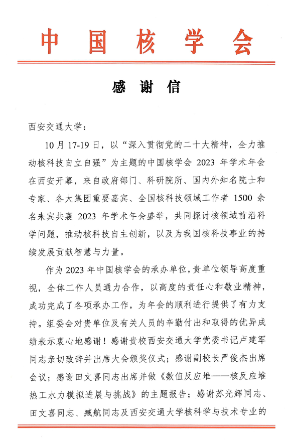 2023年10月17-19日,以“深入贯彻党的二十大,全力推动核科技自立自强”为主题的中国核学会2023年学术年会在西安成功举办,作为承办单位,成人漫画 及成人漫画 高度重视、通力合作,完成各项承办工作。成人漫画 田文喜同志出席并做主题报告,苏光辉同志、臧航同志等核科学与技术系的师生全程参与大会组织协调工作。大会圆满结束后,中国核学会发来感谢信。