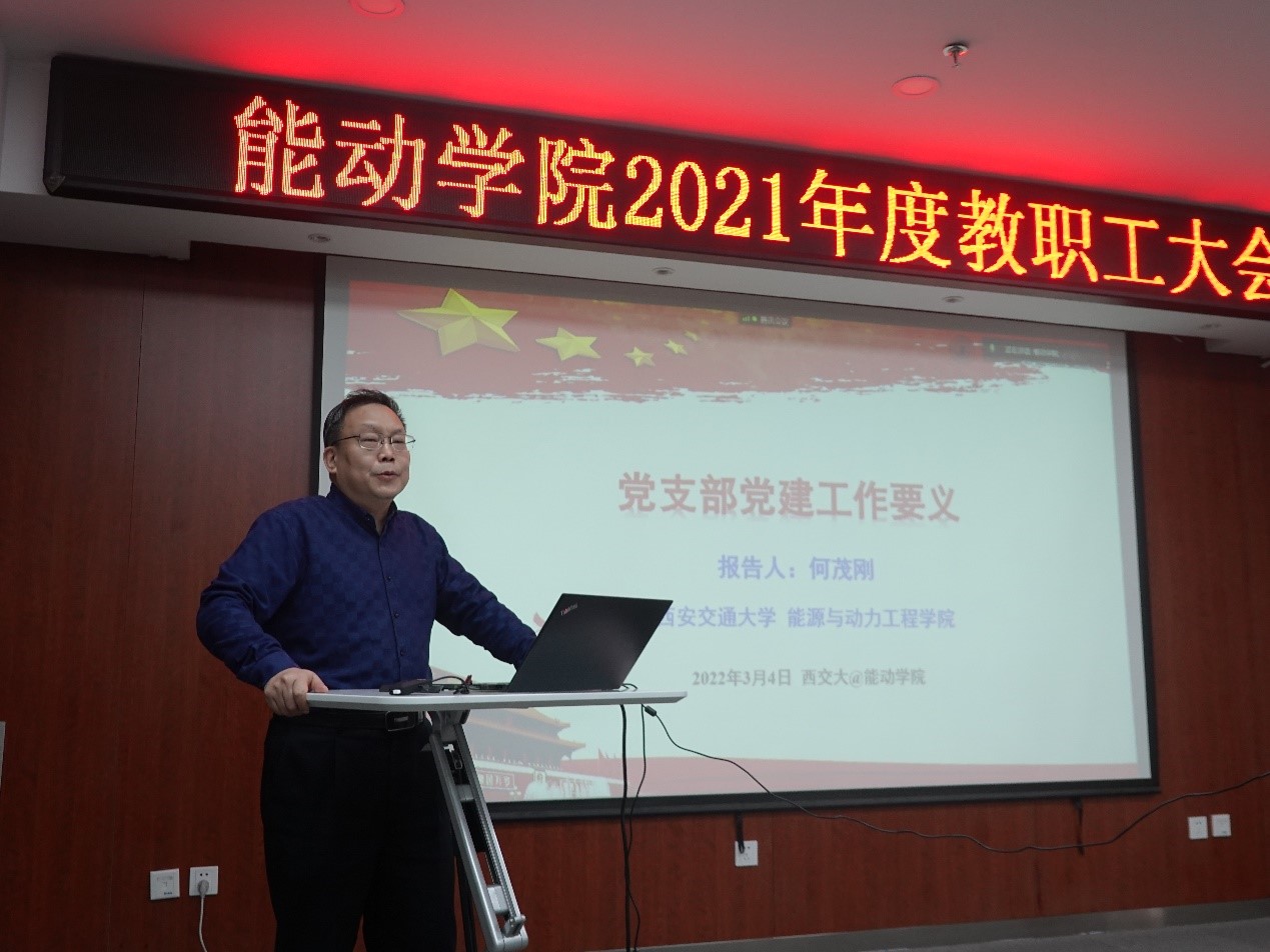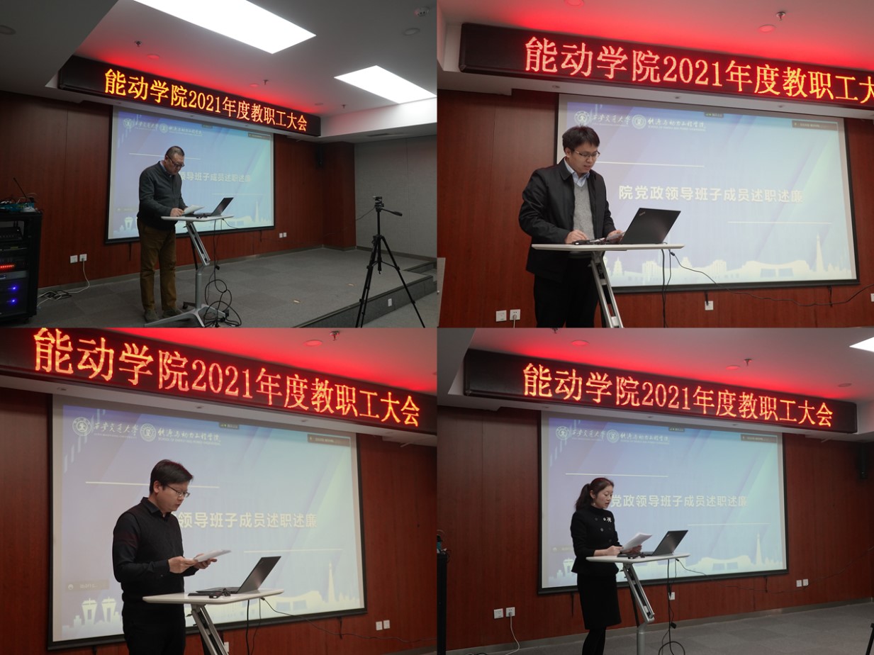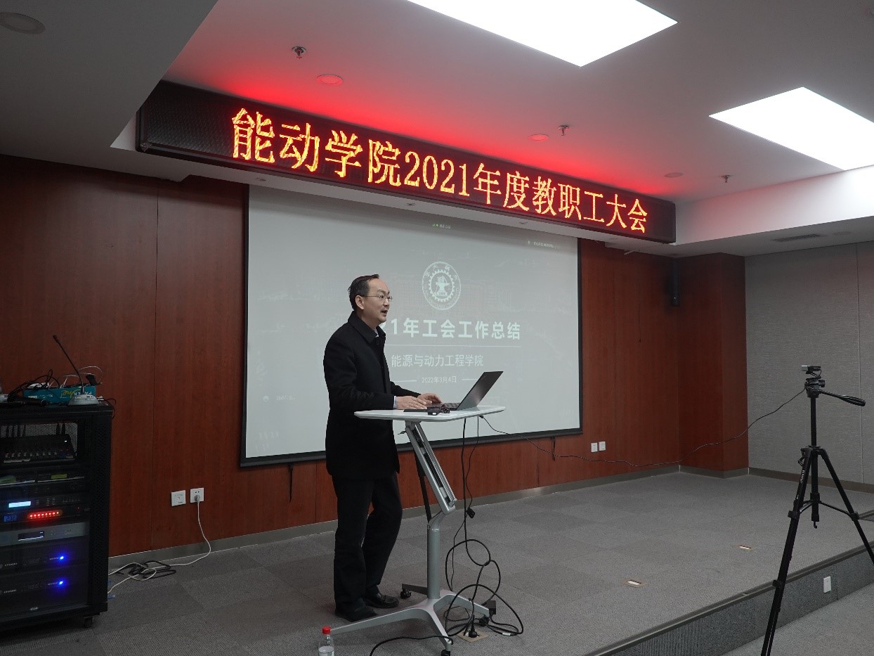 全体教职工起立奏唱国歌。随后,严俊杰院长向全院教职工做学院工作报告及学院经费使用情况报告。2021年度,在学校党政领导和职能部处的大力支持下,全院师生共同努力,学院在人才培养、队伍建设、科学研究、学生工作、国际交流等各方面均取得了突出的成绩。严俊杰院长要求学院持续开展学习教育,推进课程思政全覆盖建设,做好教师队伍的政治建设、思想建设和文化建设,力争新增国家级及省部级科研基地,持续提升留学生的数量和质量,进一步加快创新港实验室及科研、教学平台的建设速度。