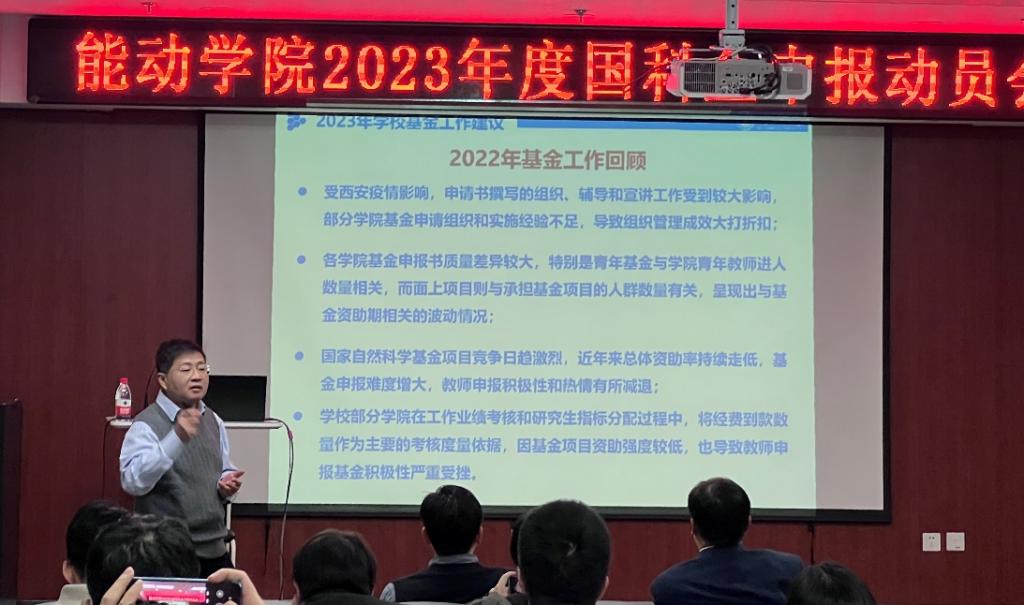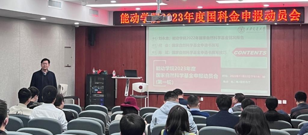 召开了2023年度国家自然科学基金申报动员会(第一轮)。科研院副院长刘永忠教授、科研院基地与海外成果处主管何会老师、动力工程多相流国家重点实验室副主任陈斌教授应邀出席并做报告,学院140余名教师以线上、线下相结合的方式参会交流。