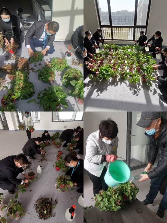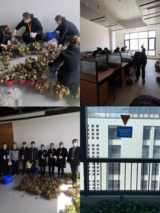 3月17日中午,金地物业的工作人员放弃午休时间在项目经理吴军的带领下配合研究院对19号楼的绿萝进行抢救。吴经理表示:“疫情无情,人有情,活动中我们与学院老师有了更近的交流,一起为干枯蔫黄的绿植建立了临时养护区,相信经过一段时间的细心修剪、浇灌养护绿萝一定会焕然新生。物业中心团队也将持之以恒为学院的师生们提供更优质的物业服务,为即将返校复课的师生们构建一个洁净优美、生机盎然的教研办公环境。”