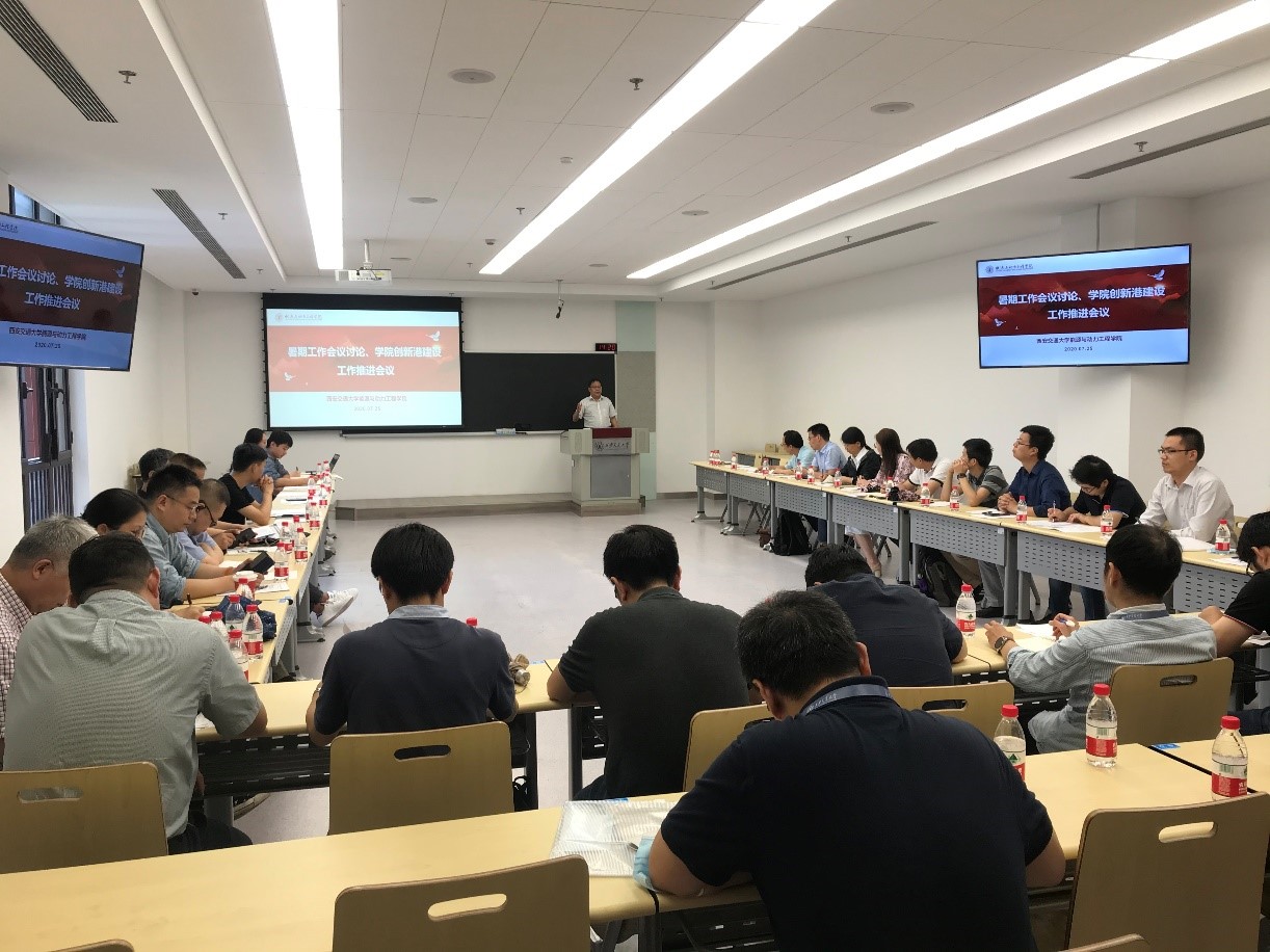 在创新港敏行楼召开2020年暑期工作讨论会暨创新港建设工作推进会,学院党政班子成员、校管干部、分党委委员,各系所负责人及实验室平台负责人以及部分教师代表参会,会议由学院党委书记何茂刚主持。