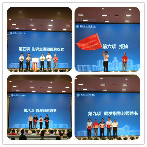 在欢快激昂的音乐声中,何茂刚书记,梁辉副部长,薛周利副部长,毕晓楠副书记共同为澎湃宣讲团揭牌。校微宣讲团指导老师陈晨向澎湃宣讲团负责人雷驰授旗,并表示澎湃宣讲团作为校微宣讲团能动分团,与校微宣讲团要紧密合作、携手共进,共同打造交大名片。随后何茂刚书记代表澎湃宣讲团为指导老师颁发聘书,雷驰为韩豫、巩倩倩、湛昊晨等顾问代表颁发顾问聘书。在总结发言中梁辉副部长从学校理论宣讲历史脉络讲起,强调高校宣讲工作的重要性及必要性,并嘱托澎湃宣讲团的成员要做好能动故事的宣传者、西迁精神的发扬者,为学校思想文化建设工作注入力量。