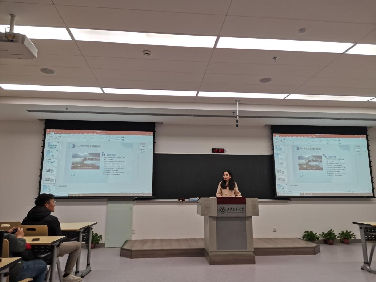 班会从四个部分开展,心理健康小知识----给大家介绍了与大学生相关的一些心理危机和心理疾病,帮助大家更好的认识到心理健康的重要性。西交心理健康咨询室的基本情况----向大家展示我校的心理咨询室的地址,设施,电话,预约方式等。轻松科研----先通过一个搞笑的小视告知大家解压需要合适的方式,接着又通过中南大学心理健康的视频课向大家展示了一些方法:正确归因、自我暗示、目标调整、合理宣泄、自我放松、丰富生活等;同时班上同学积极分享自己的小妙招和亲身经历,使活动非常热烈。小游戏----通过“彼此熟悉”和“小鸡成长记”两个游戏,加深了大家对彼此的熟悉,也使班级氛围十分融洽。