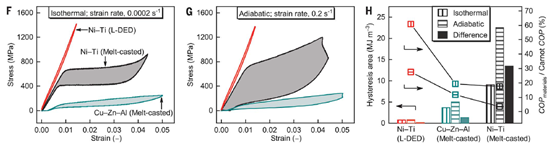 图一:A. 粉末激光定向能量沉积技术示意图;B. 镍钛合金相图;C-H. 作为范例展示,获得了柱状、管状和蜂窝状结构;F. 等温加载时各材料行为的对比;G. 绝热加载时各材料行为的对比;H. 各材料的滞后特性和效率的对比。