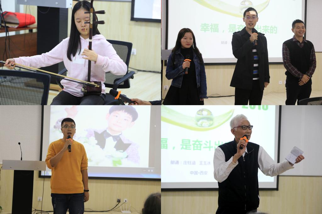 硕8029班王玉冰、硕7026班庄钰涵、学院辅导员石杨根朗诵原创诗词《爱国 · 奋斗》,退休教师朱其芳老师演唱了歌曲《那就是你》,会场始终洋溢着欢歌笑语。