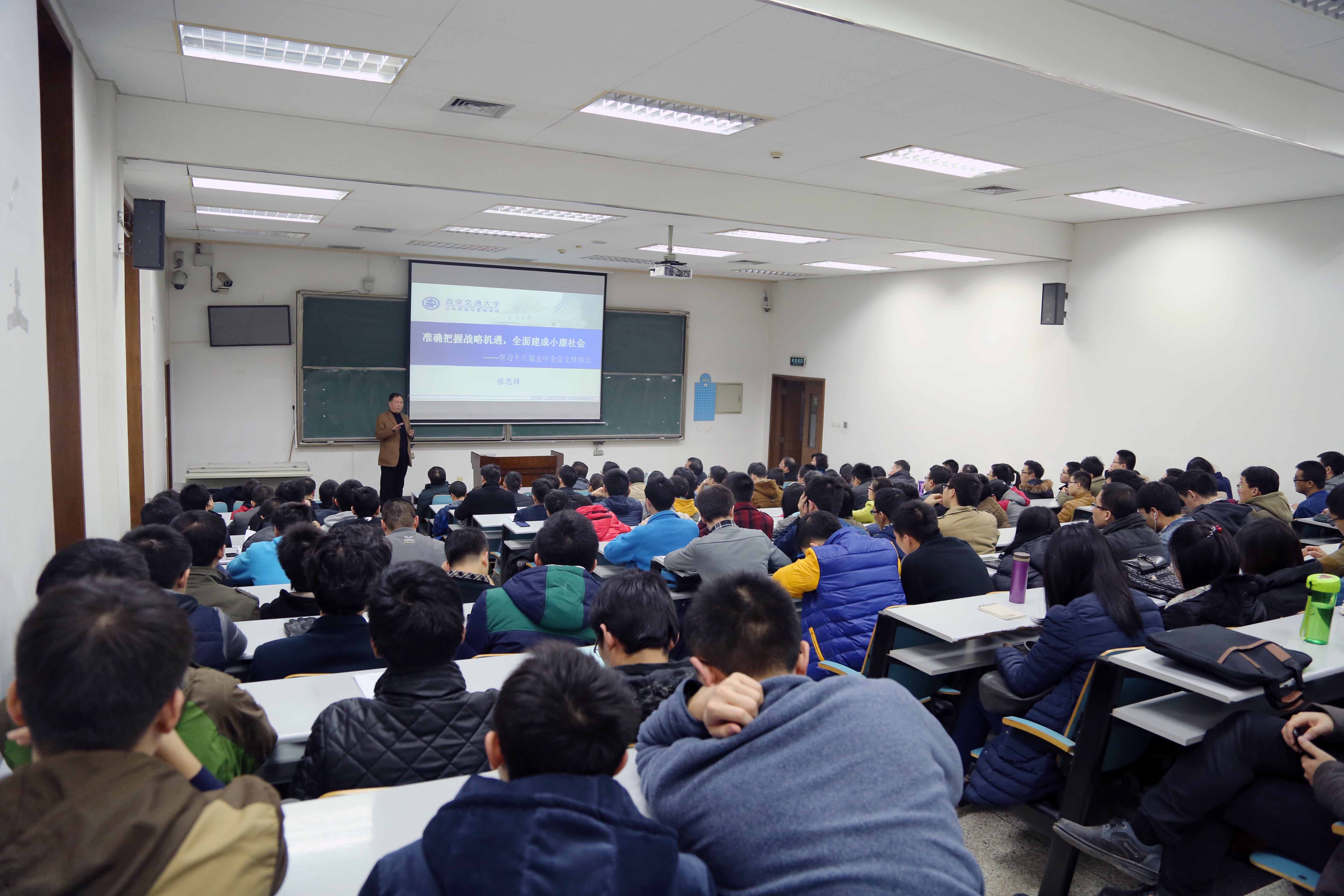 分党委组织召开十八届五中全会精神宣讲会,邀请我校公共政策与管理学院张思锋教授为学院党政班子成员、分党委委员、各系(中心)主任、党支部班子成员及师生党员代表150余人作了题为“准确把握战略机遇,全面建成小康社会”的主题宣讲,大会由分党委书记王树众教授主持。