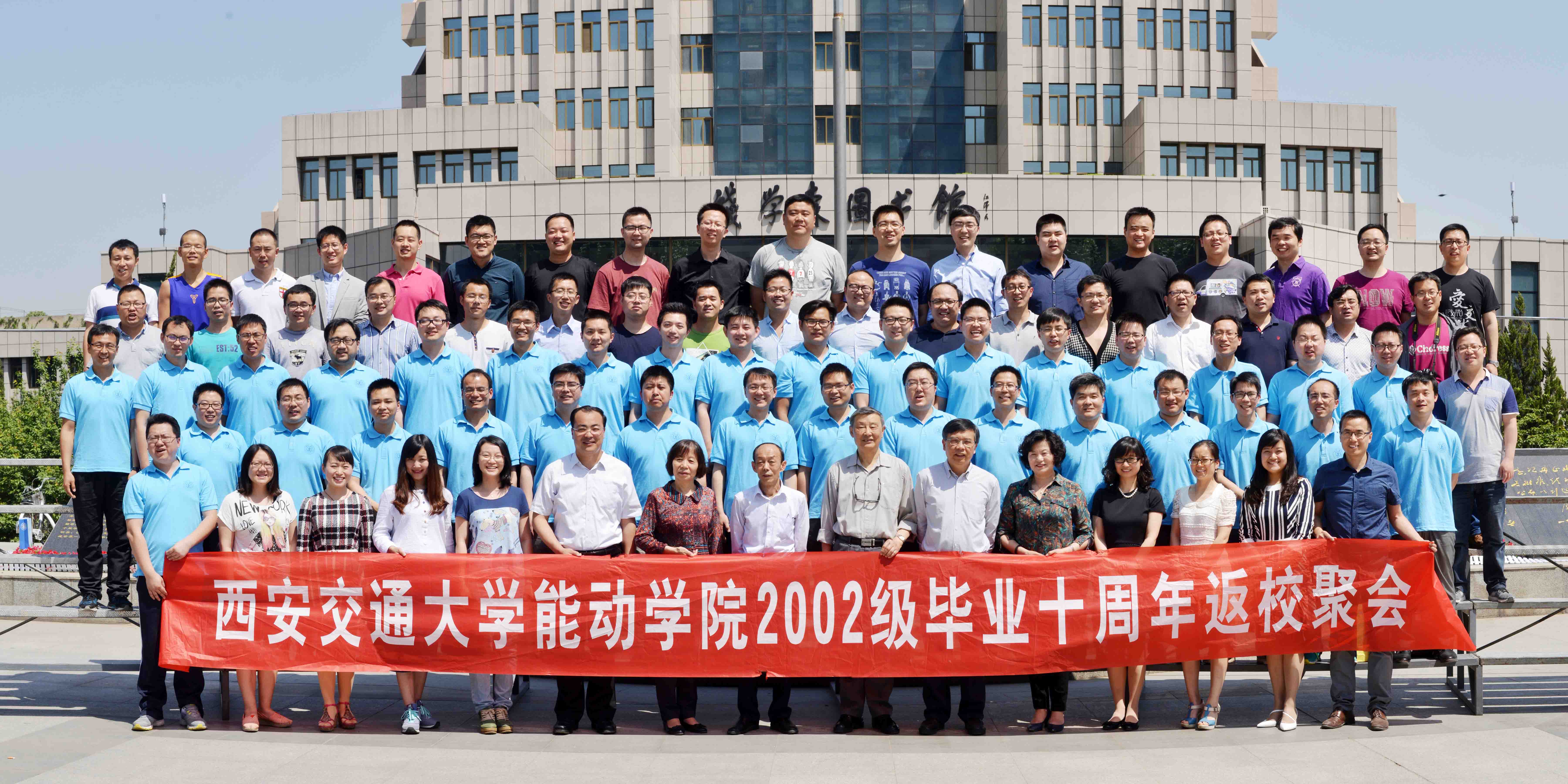 2002级校友与入学的时任老师和现任学院领导在四大发明广场合影留念,参与合影的老师包括丰镇平院长、徐通模教授、惠世恩教授、葛润莲老师,时任院团委书记徐永胜老师,以及时任辅导员叶宁和张亚玲老师。