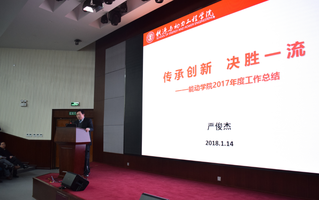 2017年度在党建工作、师资队伍建设、人才培养、学科建设、科学研究、国际合作交流、学生工作、管理与服务等方面的工作进行了总结,并对学院2018年工作重点做了部署。他指出2017年学院在全体教职工的共同努力下成绩斐然:获批国家奖4项;新增中央委员会侯补委员、院士等多位杰出人才;在科研项目、科研到款、SCI论文、获批发明专利等方面均创历史新高;动力工程及工程热物理学科在“双一流”建设中被评为世界一流学科,并在教育部第四轮学科评估中取得了A+的优异成绩。在总结2017年度的工作之后,严院长也对学院2018年的重点工作进行了展望与规划,特别是对绩效津贴改革方案、创新港内涵建设等工作进行了详细部署,也对学院各项指标提出了更高的要求。严院长指出,面对2017年突出的各项业绩,全院上下应该再接再厉,在2018年度争取更好的成绩。