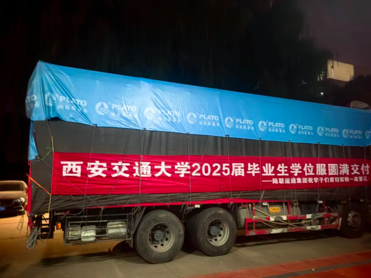 “陆联运通”车辆披星而来,“前程似锦 一路繁花”的祝福高悬车身,传递着校友对学弟学妹的暖心祝福。