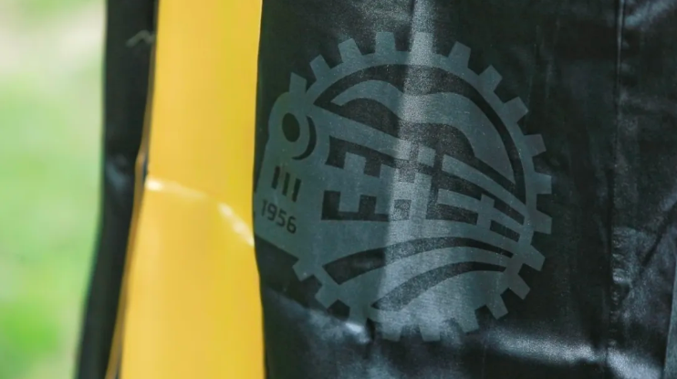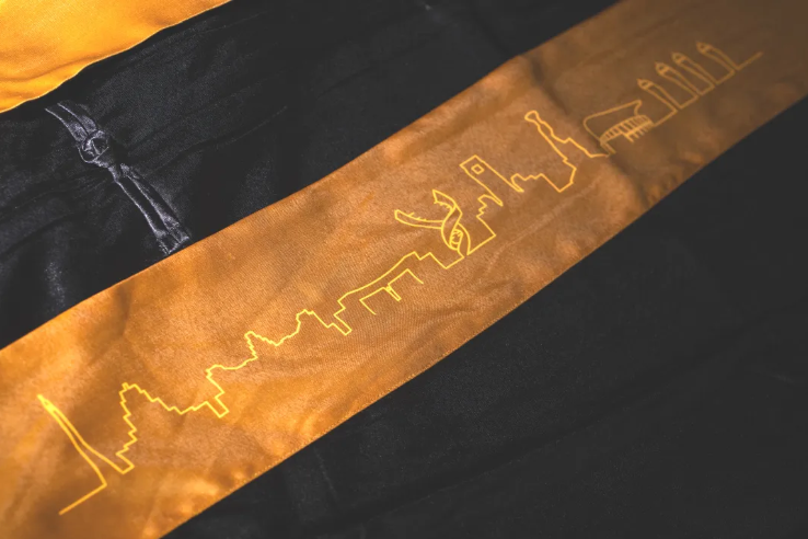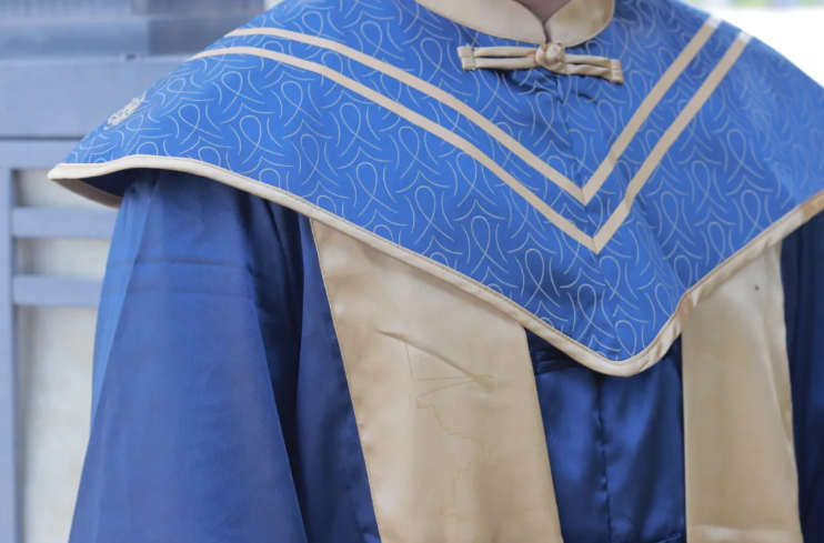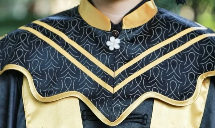 袍左下角印本色西迁标识图案,将西迁精神转化为可触可感的视觉符号,激励学子赓续先辈荣光,勇担时代使命。