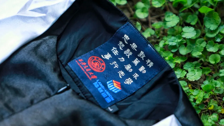 袖口拼色处印本色篆体校训,以古朴字体凝炼治学修身准则,激励学子传承校训精神,追求卓越,为世界之光。