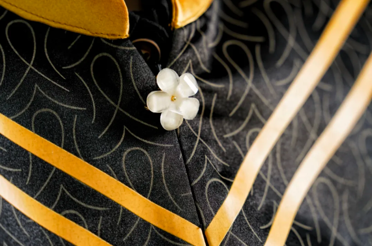云肩领口的玉面樱花扣,灵感源自校园樱花盛景。