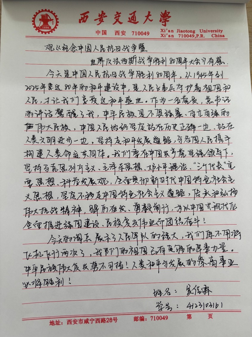 热能工程系王长安:收看纪念中国人民抗日战争暨世界反法西斯战争胜利80周年大会实况转播大会,心潮澎湃、特别激动。80年前,中国人民以巨大牺牲赢得抗日战争的伟大胜利,为世界反法西斯战争作出了不可磨灭的贡献。无数的先烈们英勇抗争与牺牲,铸就了今日和平的基石,奠定了我们现在幸福和平生活。这段历史深刻警示我们,必须铭记历史、珍爱和平、自强不息,要继承和弘扬伟大抗战精神,为实现中华民族的伟大复兴而团结奋斗。