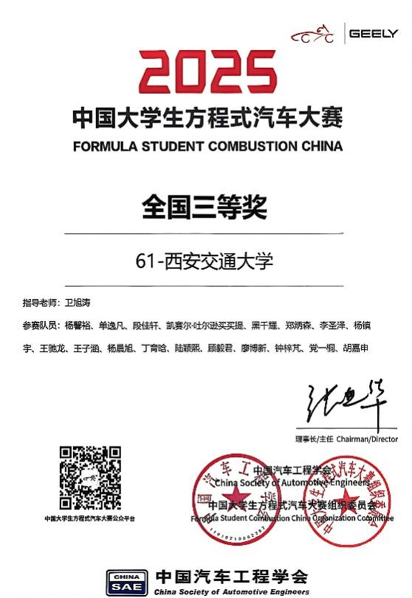毅行方程式车队(XJRT)斩获全国三等奖,彰显了交大学子在汽车工程实践领域的扎实功底与卓越实力。