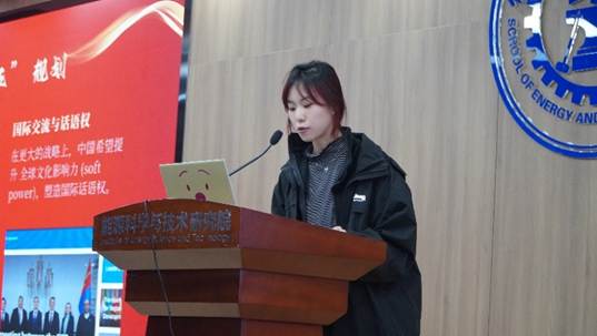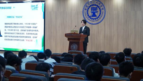 学生微选宣讲团成员李明以“两弹一星”精神为主题,带领同学们重温那段自力更生、奋发图强的峥嵘岁月。他通过讲述了王淦昌、郭永怀等老一辈科学家毅然归国、隐姓埋名的感人事迹,带领大家理解“热爱祖国、无私奉献,自力更生、艰苦奋斗,大力协同、勇于登攀”的“两弹一星”精神内涵。宣讲结束后,同学们深受触动,并围绕未来国家能源产业结构发展展开热烈讨论。