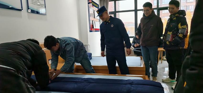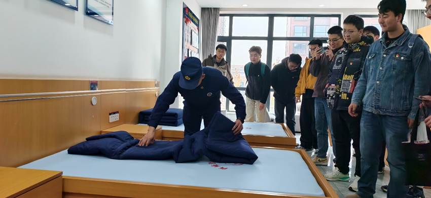 走进消防员宿舍,整洁划一的内务设置让师生们眼前一亮。消防指战员现场演示将松软棉被叠成“豆腐块”的全过程,压、折、抠、捏,每一个动作精准利落、一丝不苟。“出门看队伍,进门看内务。”这种于细微之处彰显的严谨作风,让在场能动学子深受触动。大家纷纷表示,将把这种极致的专业精神融入科研工作,无论是实验室的数据记录、仪器操作,还是学术研究的逻辑推演、成果打磨,都将秉持一丝不苟、严谨求实的态度,筑牢科研工作的“作风防线”。
