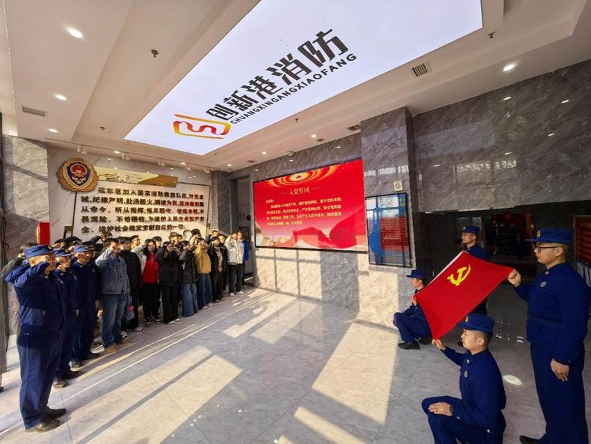 党建红引领火焰蓝,初心使命共践行。在消防站一楼大厅,全体党员整齐列队,面向鲜红的党旗庄严宣誓。铿锵有力的入党誓词回荡在大厅,这既是对党员身份的再次淬炼,更是对守护人民生命财产安全这一共同使命的庄严承诺,进一步凝聚起“党建引领保安全”的思想共识。