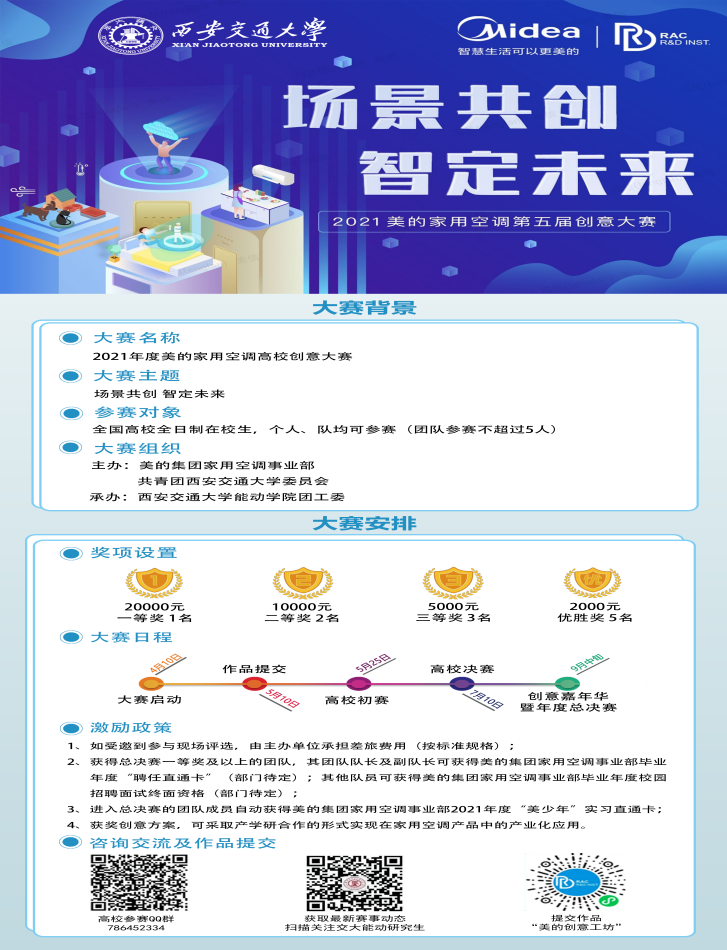 进行2021美的家用空调创意大赛高校决赛,邀请高校老师、内部专家及领导对作品进行现场评审,现场评选出一等奖1名,二等奖2名,三等奖3名,优胜奖若干名。同时推选出4个优胜项目提案(根据作品质量可空缺)进入美的总决赛。