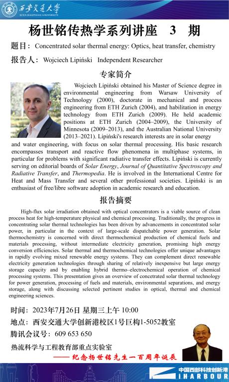 2023年7月26日(星期三)上午10点,举办“杨世铭传热学系列讲座”第三期,纪念杨世铭先生一百周年诞展。