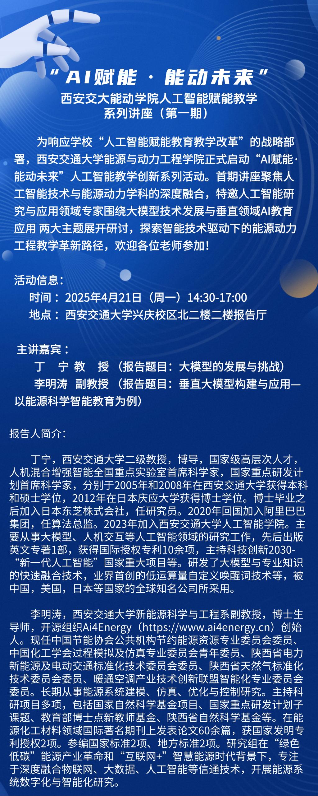 正式启动“AI赋能·能动未来”人工智能教学创新系列活动。首期讲座聚焦人工智能技术与能源动力学科的深度融合,特邀人工智能研究与应用领域专家围绕大模型技术发展与垂直领域AI教育应用 两大主题展开研讨,探索智能技术驱动下的教学革新路径,欢迎学院各位老师参加!