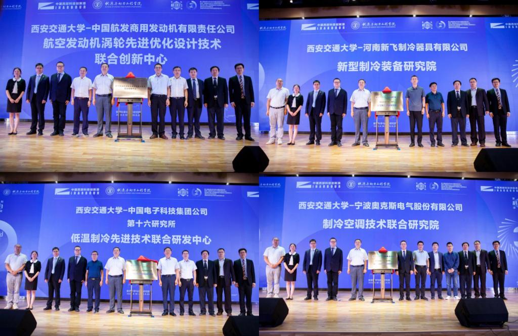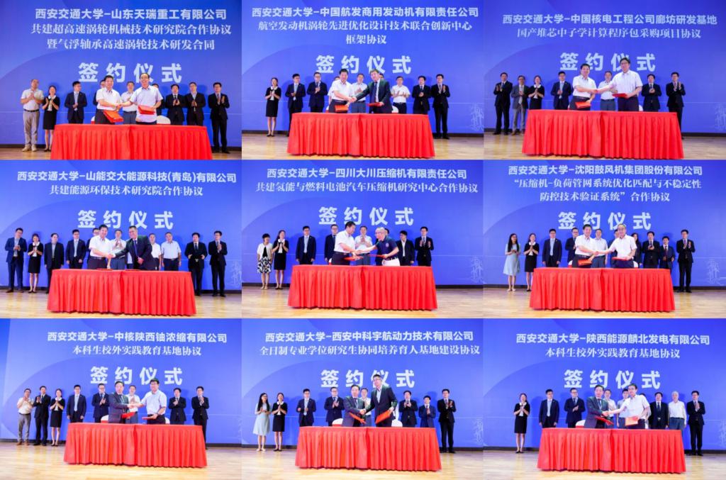 大会举行了行业领军企业与西安交大在产学研项目、合作共建研发基地及高水平试验平台、以及人才合作培养等方面的签约仪式。在王铁军副校长、严俊杰院长及合作单位领导的共同见证下,科研院常务副院长黄忠德代表学校与山东天瑞重工有限公司、山能交大能源科技(青岛)有限公司、四川大川压缩机有限责任公司、沈鼓集团等行业领军企业签署科研大项目或合作协议;研究生院常务副院长吴宏春代表学校与中核陕西铀浓缩有限公司、西安中科宇航动力技术有限公司、陕西能源麟北发电有限公司等单位签署大学生实习实践基地合作协议。王铁军副校长还代表学校为西安交大-新飞新型制冷装备研究院、西安交大-奥克斯制冷空调技术联合研究院揭牌。