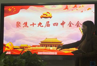 会议第三项,由许子倩同志进行时事分享——聚焦十九届四中全会。她分别从全会基本情况、总体目标及工作要求、全会公报热词分析等角度对全会整体进行介绍。