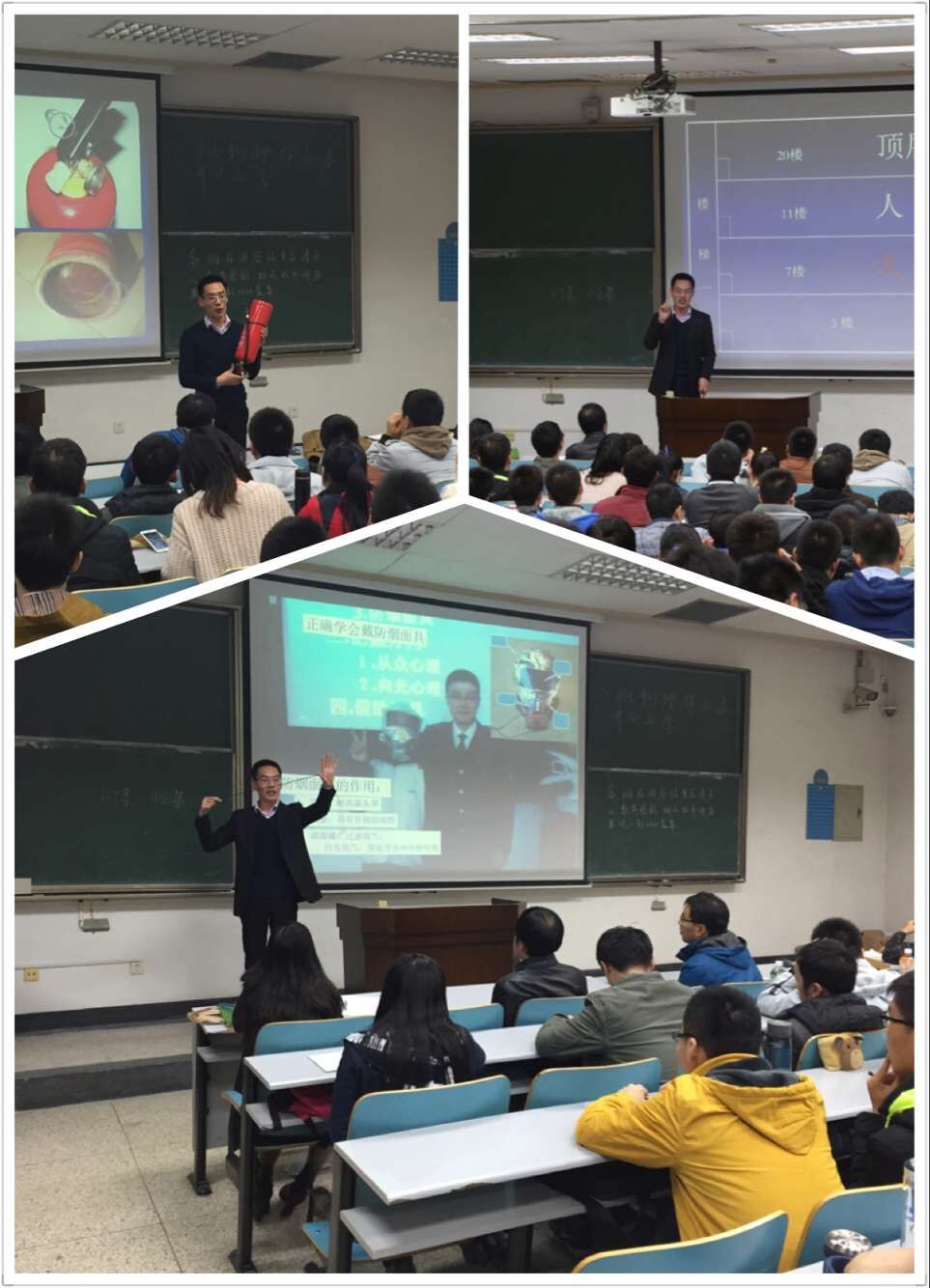 在讲座中,闫教官首先通过一系列的消防安全数据让同学们深刻地认识到消防安全的重要性。闫教官紧接着围绕“小火怎么灭,大火怎么逃”的主题,结合校园常见火灾事例,着重向同学们介绍了发生火灾时的紧急逃生原则、逃生技巧和自救方法,指导同学们通过有效的方法将损失降到最低,最大限度的保障生命财产安全。接下来闫教官围绕着近几年发生的全国重特大火灾事故,结合震撼的图像资料及具体数字,真实的呈现了各起火灾发生的原因,全方位地为大家介绍其预防和应对方案,进一步为同学们树立了“防火于未燃,灭火于初燃”的安全消防观。讲座最后,闫教官现场演示了灭火器的使用技巧,传授了消防绳的打结方法,同时就校园安全隐患、校园自救方案与同学们进行了交流互动。闫教官幽默而富有哲理的讲解,赢得了大家的阵阵掌声。