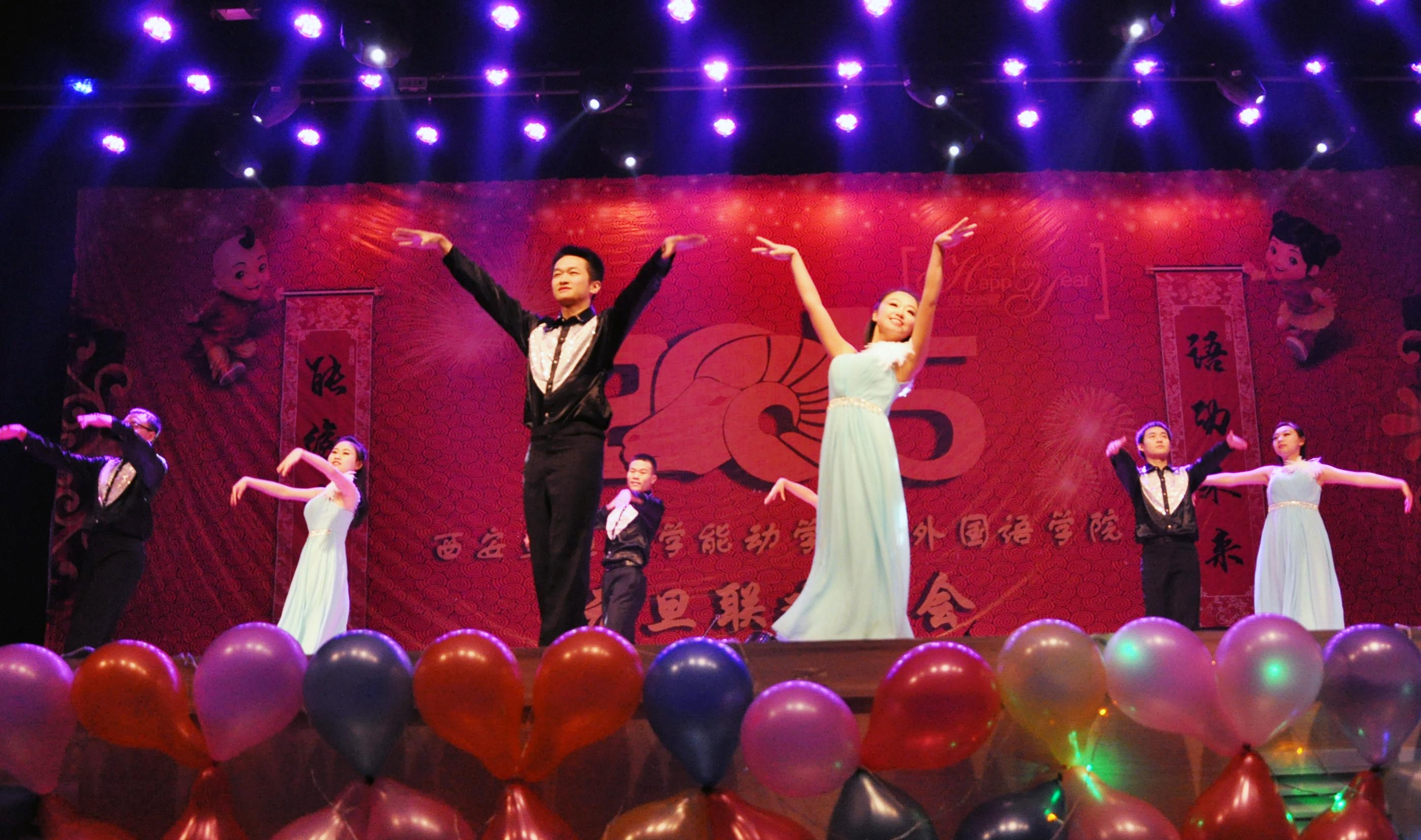 院长丰镇平教授向广大同学致新年贺词,借此机会表达了对交大学子们的殷切期望以及对伟大祖国的美好祝愿,希望同学们能够为实现中国梦而奋发图强、努力拼搏、认真学习、勇往直前。晚会当天正好还是伟大领袖毛泽东诞辰121周年纪念日,丰院长也希望同学们能够继承老一辈的优良传统,为实现中华民族伟大复兴而奋斗。外国语学院院长杨瑞英教授用英语向全校师生表达了新年的祝福,祝愿两院友谊越来越深厚,祝福同学们新年新面貌,科研和学习生活更上一层楼!