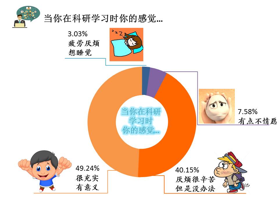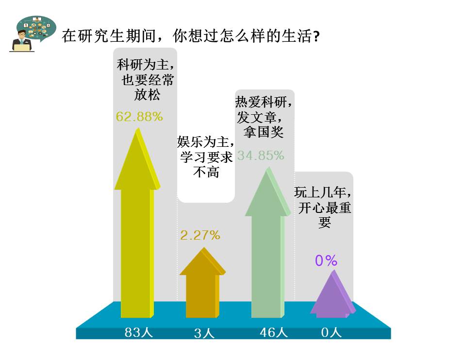通过对能动院新生的调查,发现了极大部分同学把科研放在了研究生生活的第一位,三分之二的同学认为学习和娱乐相结合是自己生活的目标