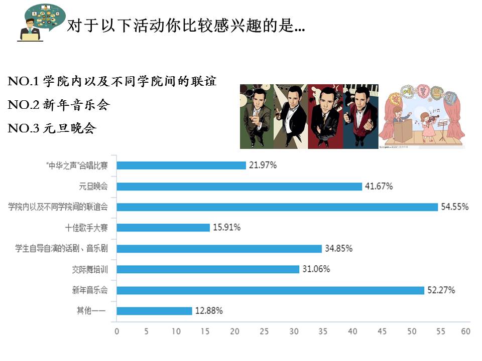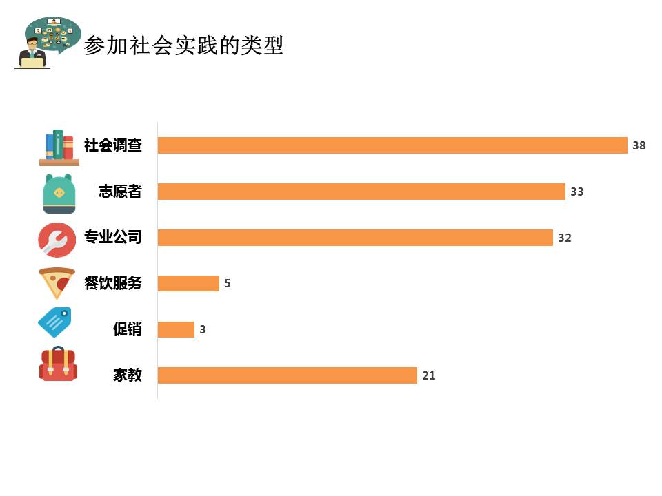 在社会实践中,做社会调研的人数比较多,其次是做志愿者和到本专业的公司实习,做促销和餐饮服务的人数最少,说明同学们在选择社会调研类型的时候,比较看重培养自己的能力,创造社会价值,是否与专业对口等因素,而对于相对较辛苦的服务类活动关注较少。