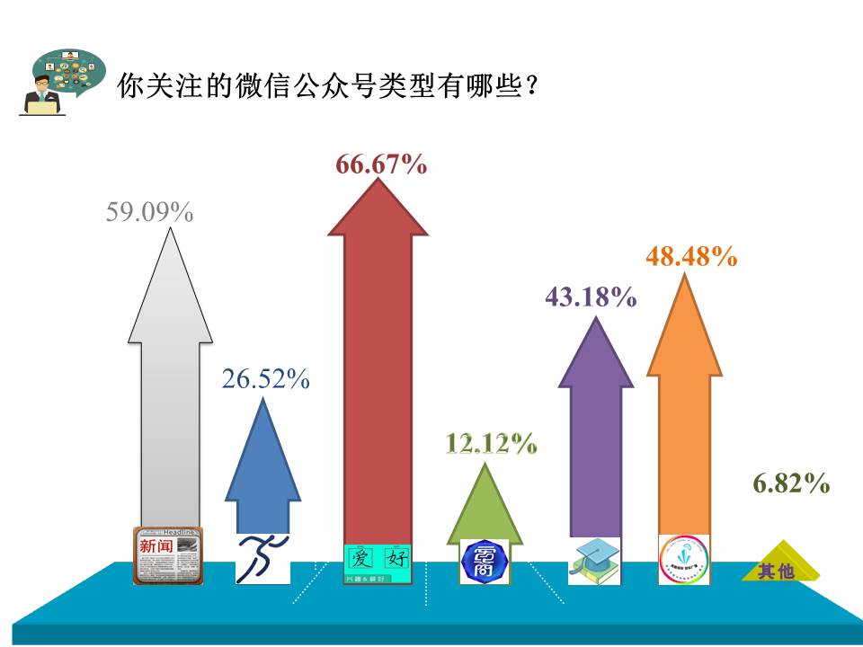 大家微信关注的公众号主要是新闻时事类和兴趣爱好类,其次是校园媒体和专业知识类,也有部分人关注体育娱乐类和电商类。