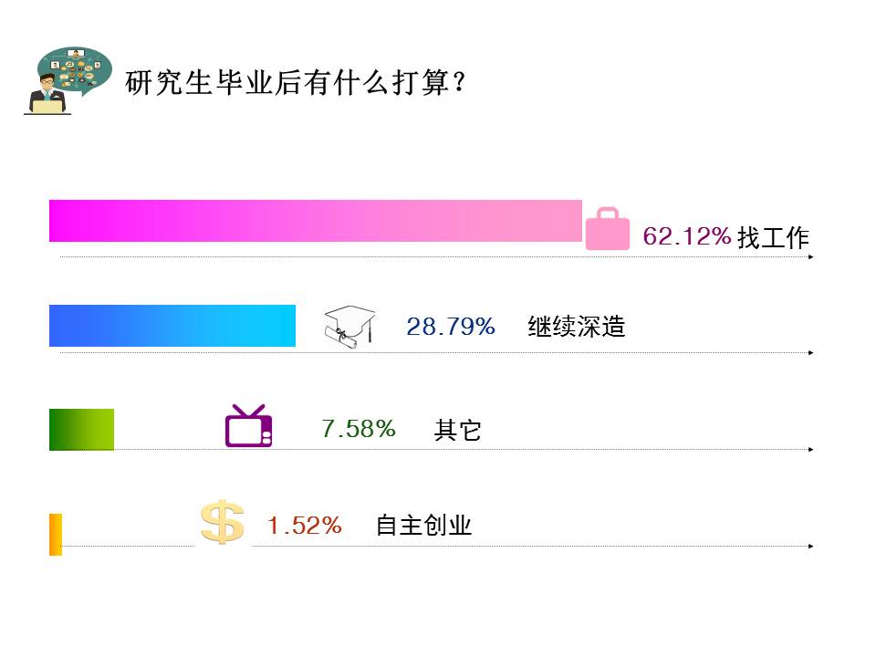 62.1%的同学在学业完成后会去选择找工作,28.8%的同学会选择在学校继续深造,1.5%的选择自主创业,7.5%的同学还有其它适合自己的打算。