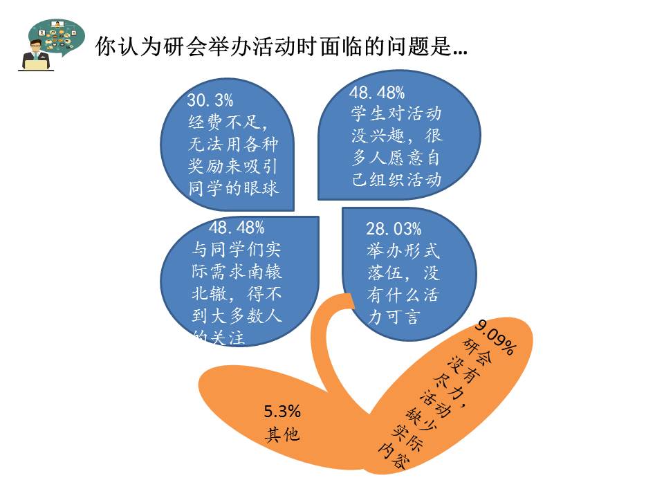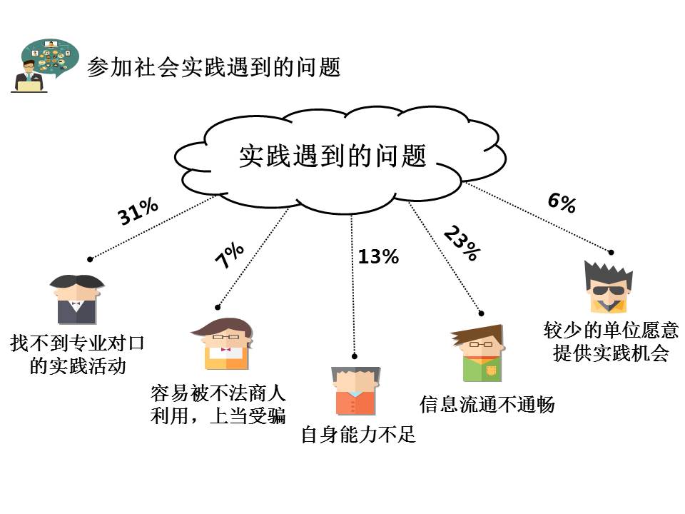 对于实践中所遇到的问题,大多是很难找到专业对口的实践活动,其次是信息流通难以通畅,也有小部分同学从自身能力出发,担心能力不足难以胜任,考虑最少的问题是遇到诈骗和提供实践机会的单位少。说明同学们在社会实践中更期望能从事专业相关的活动,考虑较为全面。以后若在信息沟通中注重社会实践活动的公开性,实时性,加大交流协调,增强信心,就能有效解决诸多问题。
