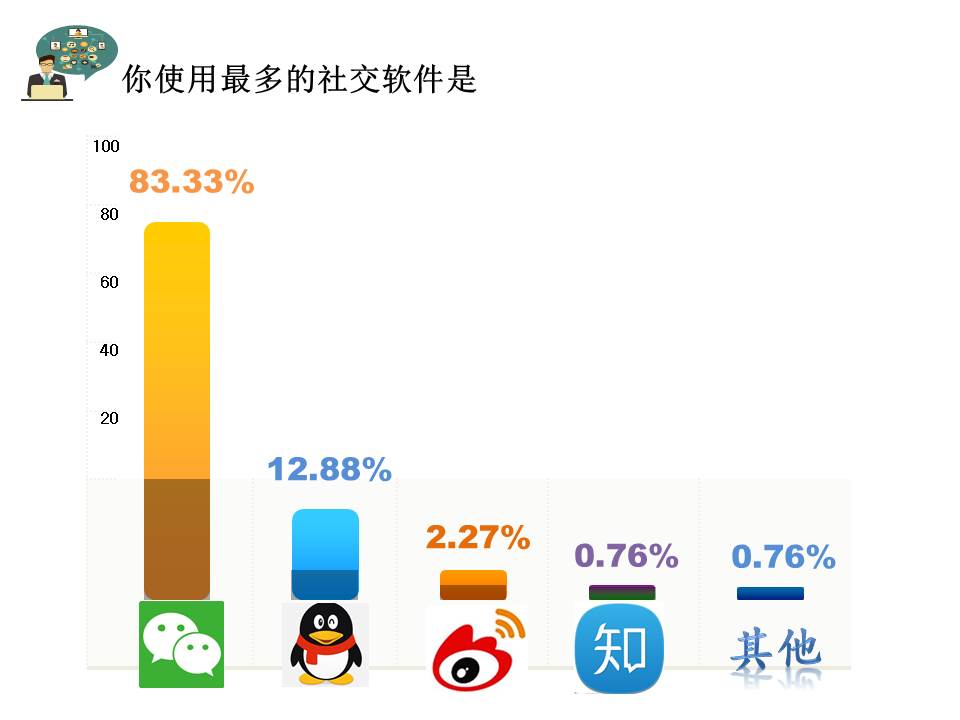 从上图可以看出,百分之83.33的人都在使用微信社交,微信这是要上天呐!