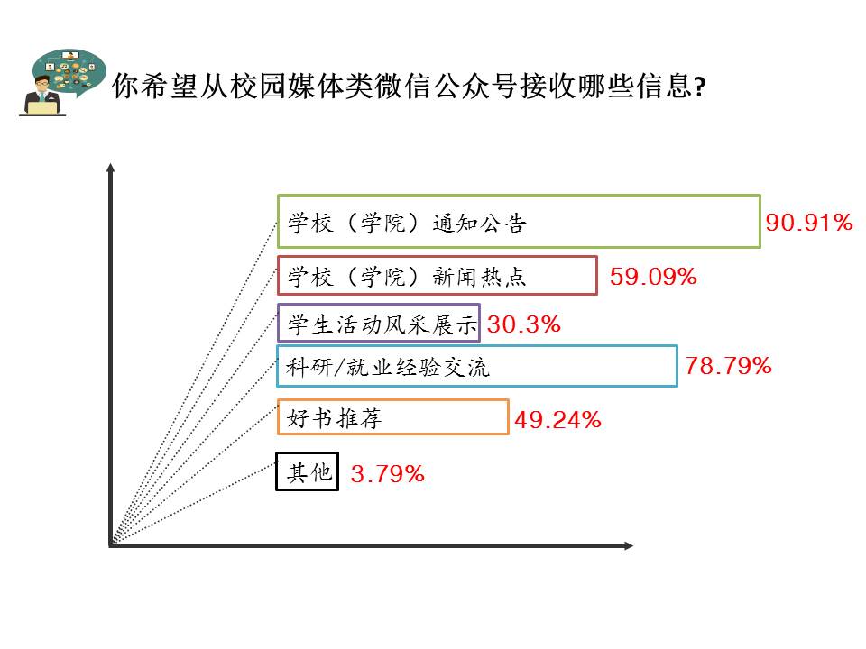 大家更希望从公众号获得学校(学院)通知公告,科研/就业经验交流,学校(学院)新闻热点,以及好书推荐等,也有部分同学希望从公众号看到学生活风参展示等。