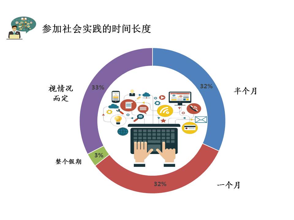 同学们眼中社会实践的时间划分较为均衡,约三分之一认为半个月,三分之一认为一个月,三分之一认为应该视情况而定,还有小部分认为是整个假期。不同人眼中不同看法,总的来说社会实践的时间趋于半个月以上乃至更长,让能力得到充分锻炼,学到更多的东西。