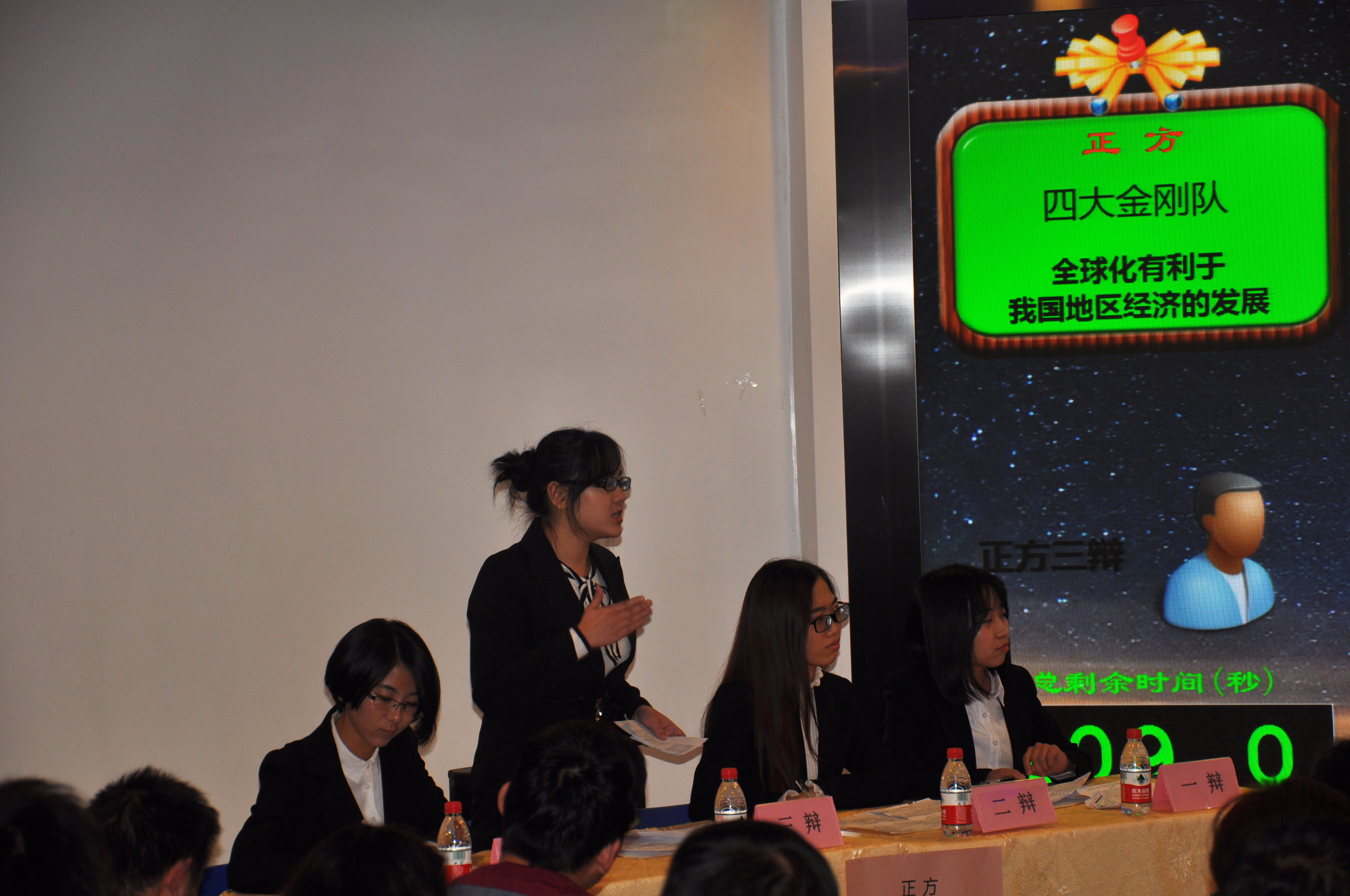 来自我校交响团的四位同学所带来的一首弦乐四重奏《一步之遥》正式吹响了决赛的号角。这场激动人心的巅峰对决在正方“四大金刚”队和反方“鬼谷子”队之间展开,双方的辩题是“全球化是否有利于我国地区经济的发展”。正方一辩先声夺人,分别从经济的总量、结构和发展角度阐述了全球化对我国经济的有利影响,思维缜密,论据充分。而反方一辩也充分发挥了后发优势,首先对正方论点进行了反驳,进而逐条分析了“全球化不利于我国地区经济的发展”诸多方面,据理力争,口若悬河。在之后的攻辩与自由辩论环节,双方辩手争锋相对,火花四溅,激烈的比赛将辩手们的口才与应变能力发挥得淋漓尽致。赛场上唇枪舌剑,佳句频频,瞬间将观众们的热情点燃。