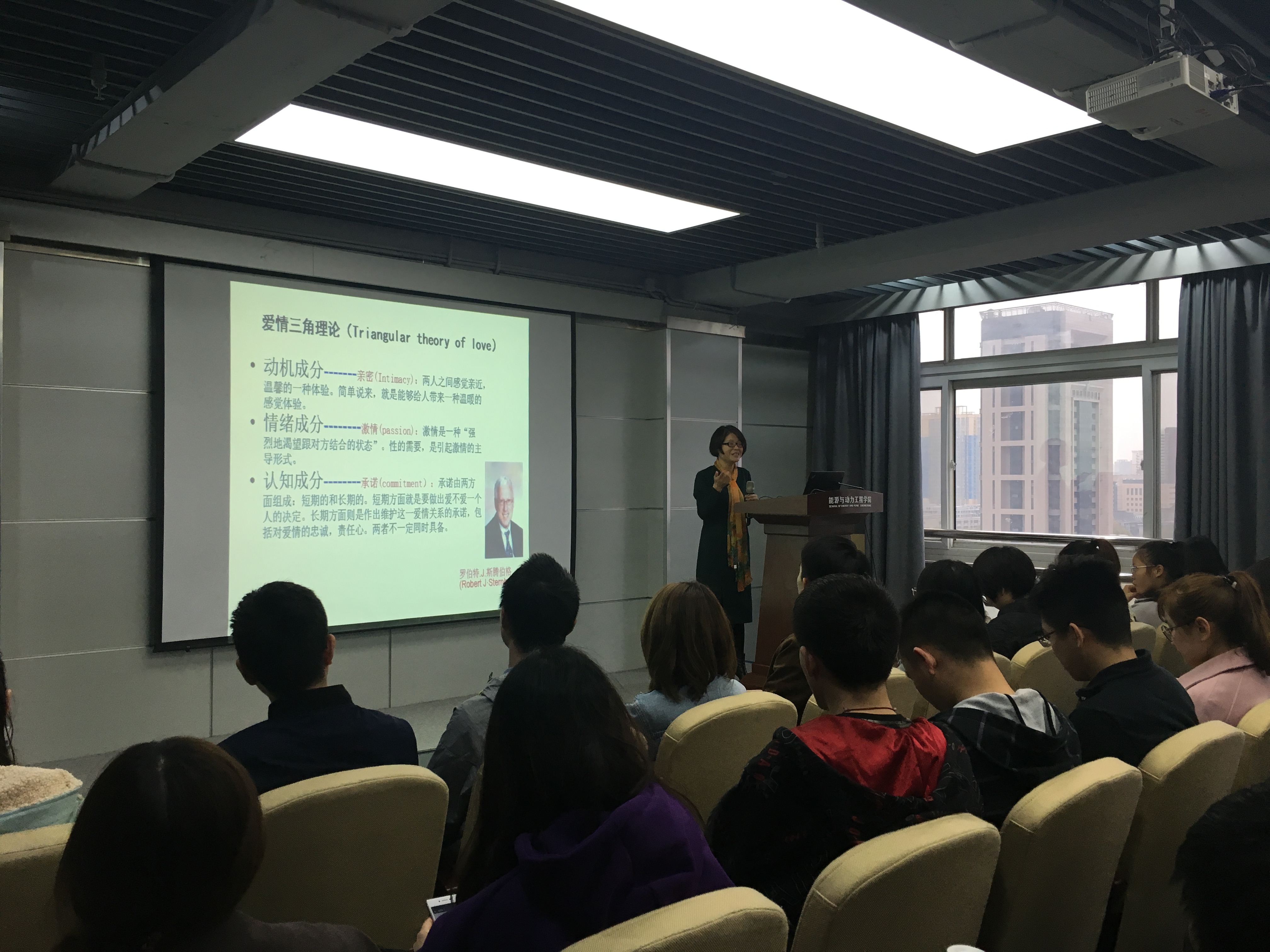在讲座中,李红燕老师分析了爱情各阶段可能会出现的问题以及“爱情三角理论”,指出18到25岁就是爱情的关键期,因为中国人恋爱期非常短暂,结婚到生孩子,再到养育孩子会花费巨大的精力,所以恋爱要趁早。李老师给同学们详细的讲解了爱情的四个阶段,分析了每个阶段恋爱所遇到的困难与挫折,并向同学们提出了有益的建议,也跟大家分享了一些为爱情加分的小妙招。