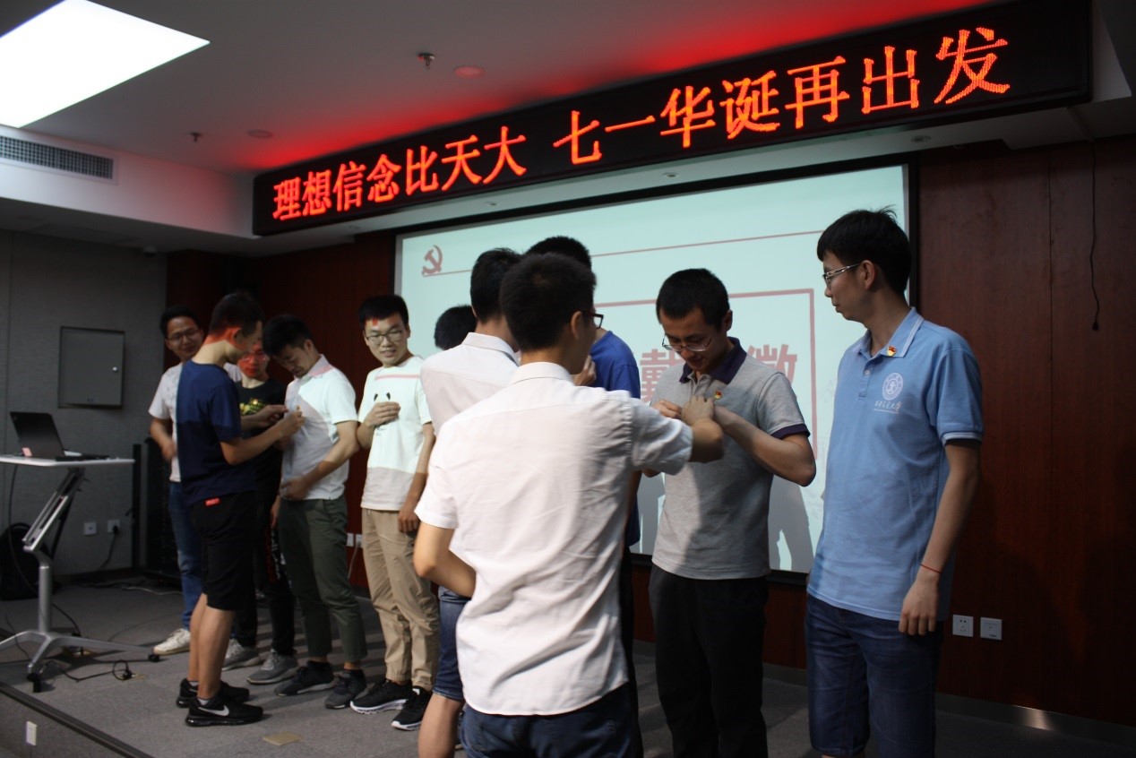 在党员们整齐嘹亮的国歌声后,预备党员入党宣誓仪式正式开始。张晓芳老师和各研究生党支部书记代表依次为预备党员们佩戴党徽胸章,鲜艳的党旗述说着中国共产党97年的光辉历程,金黄的“为人民服务”则代表着共产党员的理想信念,预备党员们怀着崇敬和激动,接过了沉甸甸的党徽,也接过了共产主义接班人的使命。