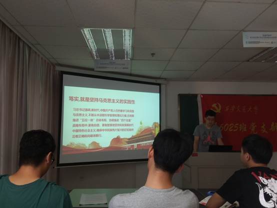 首先,戚霁同志作了习近平总书记在纪念马克思诞辰200周年大会讲话精神的学习分享。戚霁同志指出,用习近平总书记的话可以用“三个一生”概括马克思的伟大品格,即马克思的一生,是胸怀崇高理想、为人类解放不懈奋斗的一生;是不畏艰难险阻、为追求真理而勇攀思想高峰的一生;是为推翻旧世界、建立新世界而不息战斗的一生。戚霁同志认为革命精神澎湃于马克思主义理论和实践。就理论而言,马克思的墓碑上刻着的一句话可以很好的概括哲学家的价值——“The philosophers have only interpreted the world in various ways ; The point however is to change it.” (哲学家们只是以不同的方式解释世界,问题在于改变世界。)哲学的魅力在于探索世界的本质,让人类更好的认识世界,所以马克思主义能够永葆其美妙青春,不断探索时代发展提出的新课题、回应人类社会面临的新挑战。而我们党应该坚持问题导向,坚持以我们正在做的事情为中心,是我们发展马克思主义最基本的着力点。