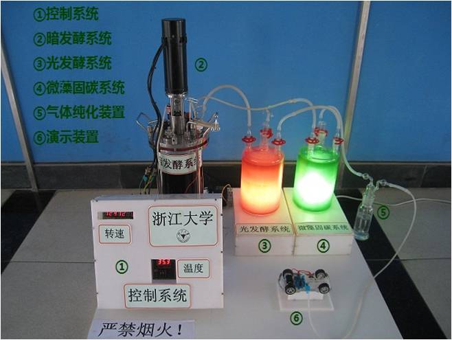 为了提高生物质发酵产氢过程中的能源转化效率并降低二氧化碳排放量,创造一个低碳、环保、绿色的环境,本项目通过实验设计了“生物质暗光发酵耦合产氢和CO2综合利用系统”。系统主要分为四个阶段:(1)生物质预处理(以秸秆为模型):将一定浓度的秸秆用0.5%NaOH溶液浸泡并微波加热预处理15分钟,然后再用纤维素酶进行水解96小时,将纤维素和半纤维素降解为可发酵的还原糖;(2)暗发酵产氢:厌氧活性污泥在35℃和pH 6.0的条件下,利用预处理后的秸秆进行暗发酵,生成氢气、二氧化碳和小分子有机酸;(3)光发酵产氢:光合细菌在6000lx的光照、30℃和初始pH 7.0的条件下进行光发酵,利用暗发酵阶段产生的小分子有机酸生成氢气和二氧化碳;(4)微藻固定二氧化碳:暗发酵和光发酵生成的气体通过微藻反应器,其中的二氧化碳成分被微藻光合作用吸收固定。如果将系统中收集的微藻作为产氢底物,同时扩大微藻固碳系统的规模,可以实现产氢和CO2零排放的理想循环!