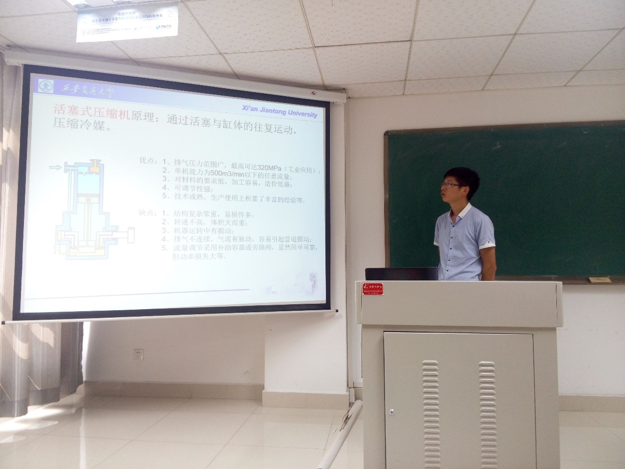 作为科创组组长,王雪松同学自身科研经历,向同学们普及了制冷循环与制冷压缩机的基本原理。围绕此次社会实践活动的主旨和目标,王雪松同学对活塞式压缩机、旋转式压缩机与涡旋式压缩机的工作原理与优缺点进行了对比分析。