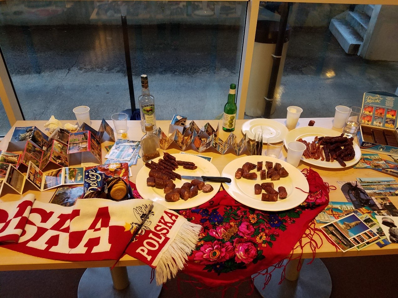 第一天的晚上是country stand环节,主要是让学员们相互熟悉、让学员们了解不同地域的文化。去之前我以为这个环节是PPT展示,然后各国的学员依次介绍自己的国家、学校和自己,然而实际上country stand是指大家布置自己的摊点,准备好食物、海报等,向来到自己摊点的同学介绍、交流。虽然和预想的不同,但我们准备的龙井、卫龙还是派上了用场,也有很多同学对兵马俑、中国结十分感兴趣。