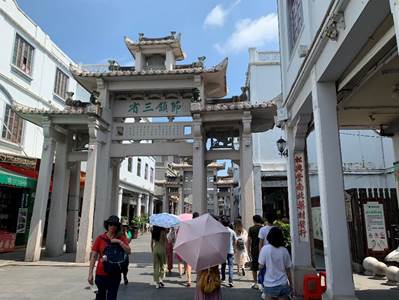 早上从企业发车,经过二十多分钟的车程来到了牌坊街。刚下车所有人目光都被一块刻有“金榜联芳”的石牌坊所吸引。接下来便是街道两侧具有南洋特色的骑楼式建筑风格。浓郁南洋风建筑和厚重牌坊之间的巧妙搭配与碰撞,让成员们立刻感受到了浓厚的潮州当地文化气息。后经HR介绍,我们得知,历史上潮州城是粤东的政治中心,在宋代之后人才辈出。而牌坊多用于对节义、科第、功德的表彰与记录。因此明清二代,在这里建立了众多牌坊,其中不乏状元榜眼牌,尚书牌等,而这也是所谓“牌坊街”名字的由来。这些牌坊经历了长期的自然风化侵蚀与人文破坏,并于90年代开始出现坍塌,但所幸的是在当地政府的重视下,部分牌坊在2004年得以被修复,目前成为潮州城一个远近闻名的景点,向外来参观者诉说着潮州历代英杰的丰功伟绩。