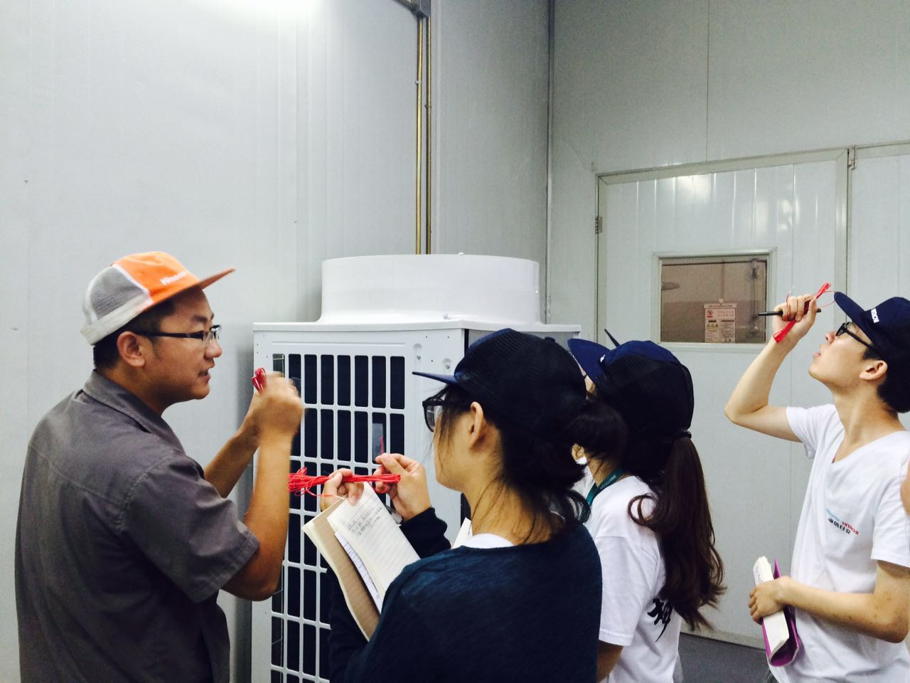 品保部(整机)负责人郭斌首先讲述了实习的项目安排,明确了注意事项。在他的介绍下,实践团成员们认识到品保部的工作内容包括整机测评、部品测评、实验管理、由性能测试室、构造电控室和产品认证室等。在各个负责人的带领下,成员们分别学习了焓差实验、EMC实验、配管应力测试、产品噪音测评、软件测试的原理和试验过程,并对照实际产品对制冷系统原理进行了深入学习,对各实验有了清晰的认识,对测试方法有了基本的掌握。学习过程中,成员们积极表达了自己的疑问,与海信日立的员工交流互动,相互学习,并对实验室的潜在改进提出了自己的见解。下午,海信日立客户支持部王松主讲的《变频多联机技术与应用》的学术报告,主要向大家介绍了变频多联机的特点及应用、变频多联机的发展历程及安装变频多联机的注意事项,进一步扩展了大家对多联机的多方位认识,王部长的报告生动形象,给实践团留下了深刻的印象。