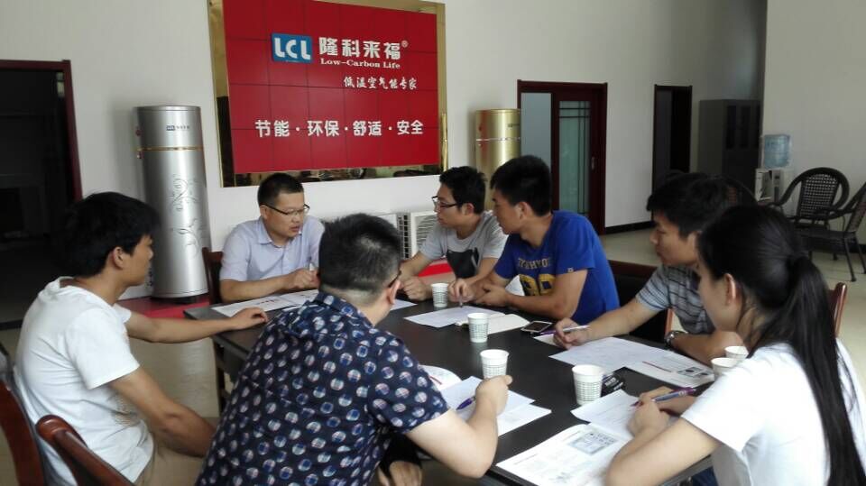 通过此次会议,我们了解到目前公司节能产品有家用、商用空气能热水器以及高端变频空调、工程定频空调系列,面临的主要问题是空气源热泵在增加制冷功能,实现制冷制热双功能工作时系统的流程布置问题、换热不足问题及振动噪声过大问题。据此,贾部长确定实践团队需要完成的任务,一是完成4HP、10HP空气源热泵分别在低温、高温和普通工况下实验数据的采集和分析,根据采集的数据和实验室主机提出高效节能的可行性方案;二是对空气源热泵4HP、10HP机组进行管路的调整以降低系统振动和噪声;三是调整大型热泵机组蒸发器内制冷剂流向,以适应机组制冷模式下的高效换热;四是调整空气源热系统的储液器和气液分离器的布置以保证制冷和制热双工况下可靠、稳定运行。