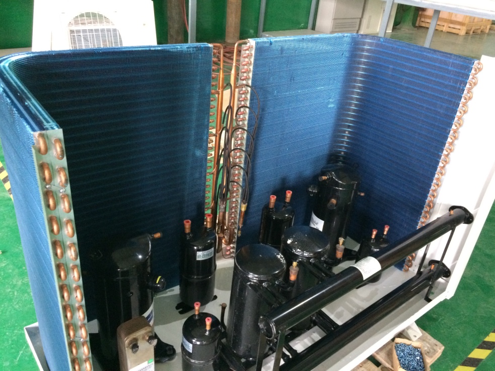 随着实习的一步步深入,我们选择将第一周的研究聚焦在储液器压力过低、冷能器出口温度过高的问题上。在贾部长的带领下,我们实地查看了负责冬天给公司整栋办公楼供暖的空气源热泵机组的运行情况。这是一台20P并联运行的机组,在当地天气工况环境下,能够保证冬天公司办公楼的室内地面温度保持在40℃左右,以此使室内空气温度保持在24℃左右。